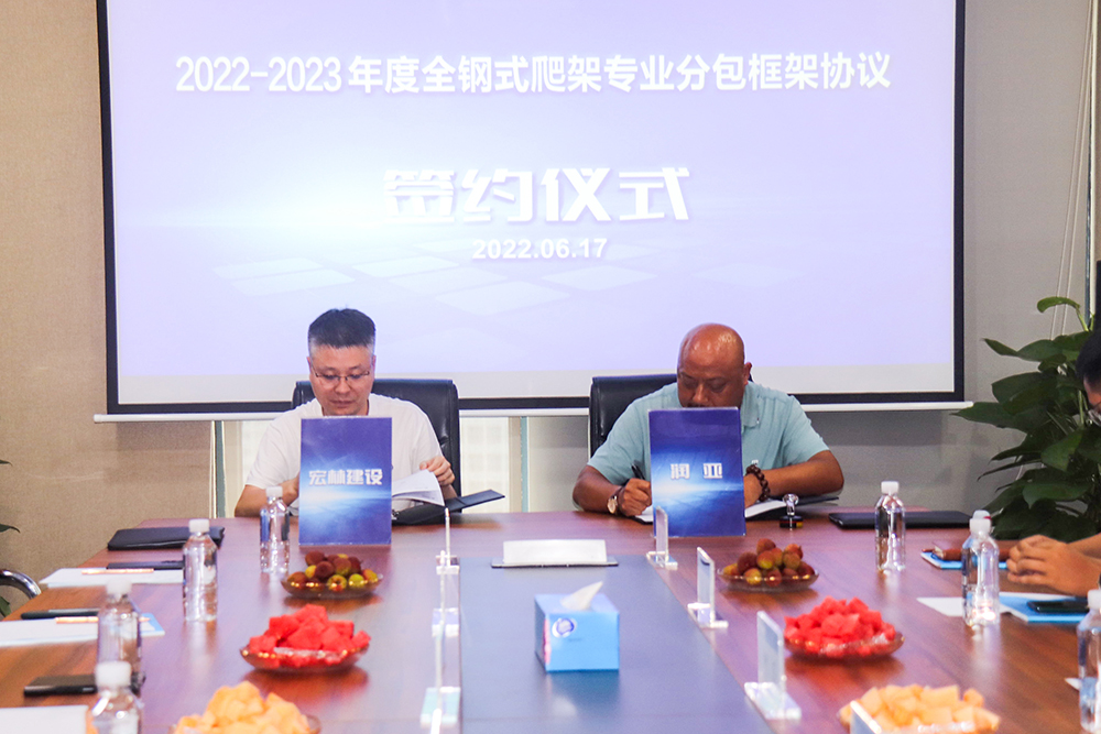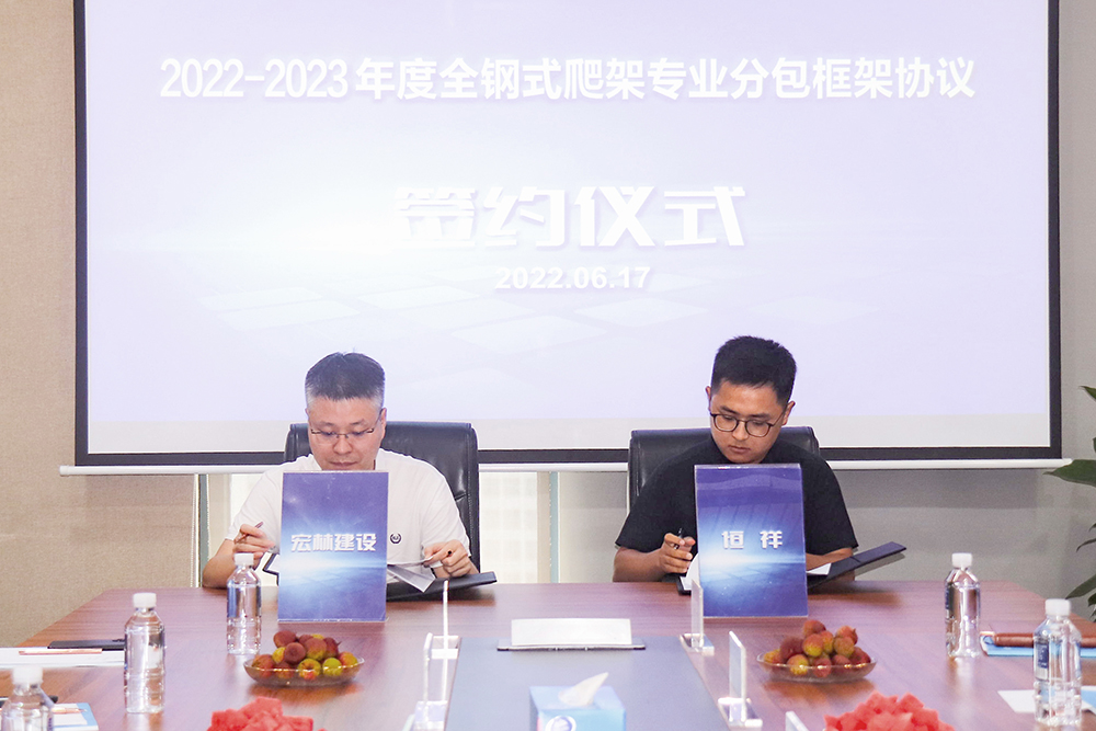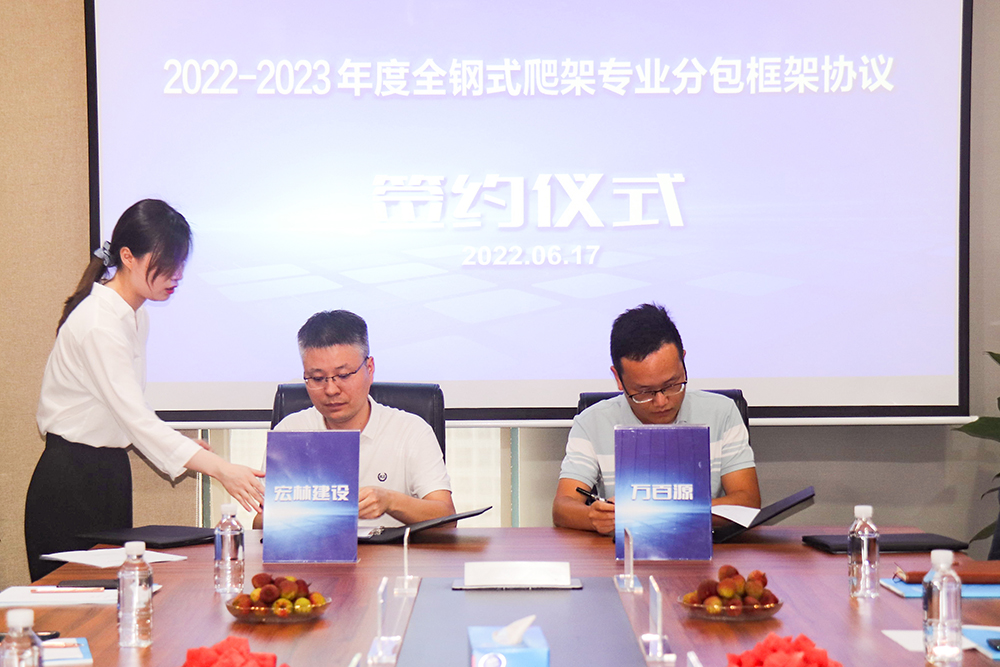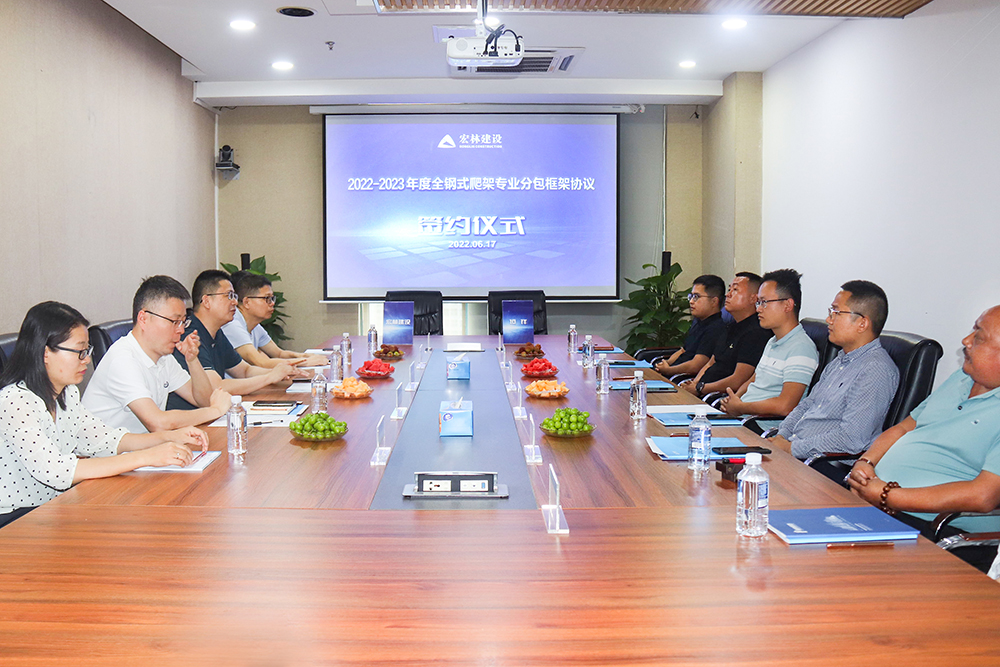近日,宏林建设2022-2023年度全钢式爬架专业分包框架协议集中签约仪式成功举行。宏林建设与万百源建筑工程、润亚建设、恒祥工程材料3家行业翘楚共同签订全钢式爬架专业分包框架协议。全钢式爬架具有安全、高效、绿色环保等系列优点,将有效提高宏林建设的施工效率和安全保障。